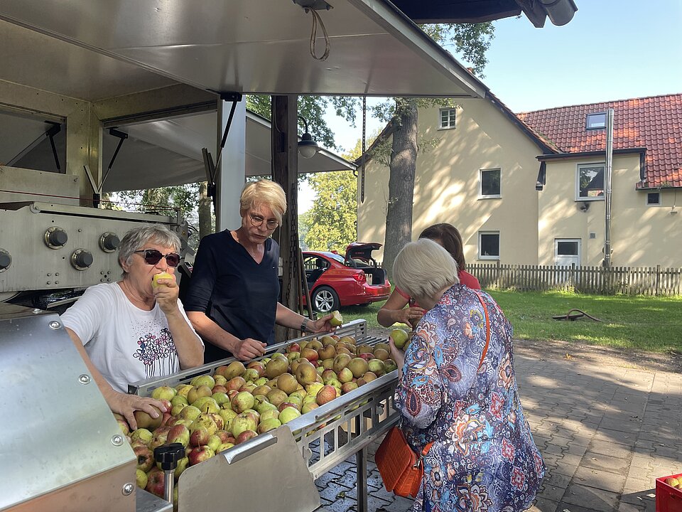 Anfang September trafen sich die Clubschwestern auf verschiedenen Streuobstwiesen für die diesjährige Apfelernte, die wieder reichhaltig ausfiel. Mit der Ernte von über 400 kg Äpfeln machten sich einige Clubschwestern auf den Weg zur mobilen Apfelpresse nach Salzkotten-Verlar. Hier wurden rund 200 l Apfelsaft in 5 bzw. 3 l Kartons abgefüllt.